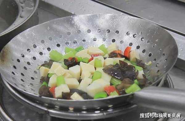 接着,我们再把笋丁,芹菜,木耳和青红椒焯水,锅内烧水,水开以后,放入笋丁,芹菜,木耳和青红椒。