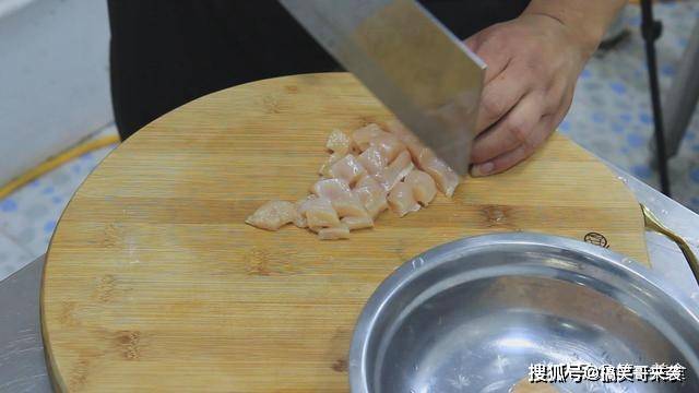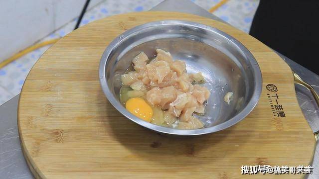 然后切成鸡丁放在盆中,打入一个鸡蛋。