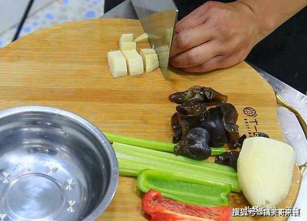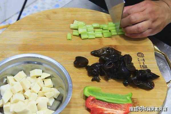 芹菜切成短一点的段,泡发好的木耳切成小块。