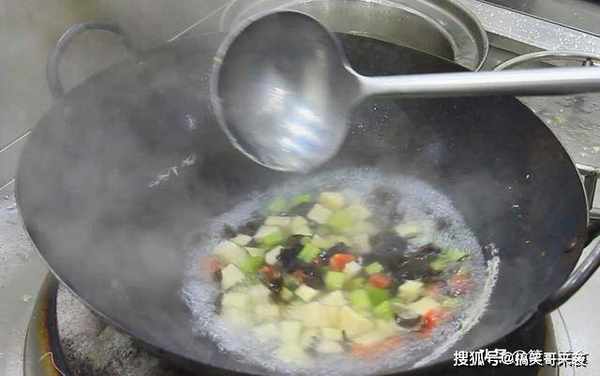 搅匀化开以后,放入笋丁,芹菜,木耳和青红椒继续翻炒,让食材充分吸收汤汁,再倒入鸡丁翻炒。