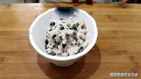 4.把山药泥盛放在碗中,加入白糖两勺,植物油少许拌匀,加入煮好的红豆黑豆抓拌均匀,准备一个盘子,铺一层保鲜膜备用。