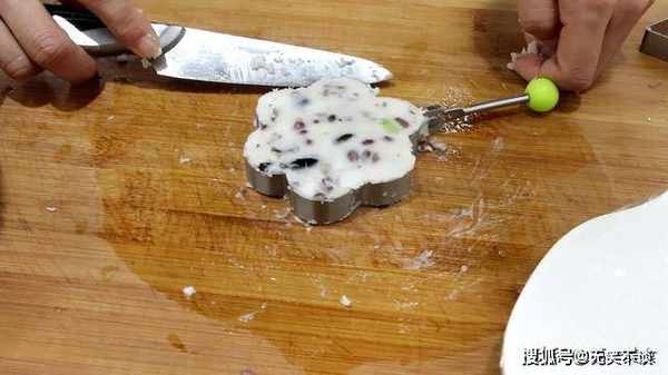 5.在案板上涂一层植物油,取出适量山药泥压扁,用模具切出不同的造型摆放在盘中。
