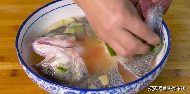 2. 大碗中放啤酒和葱姜,将鲈鱼放进去腌制,涂抹均匀腌制15分钟。