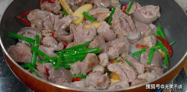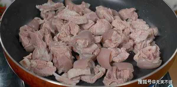 5. 锅中放少许食用油,油微热下入羊肉煸炒,将水分炒干。