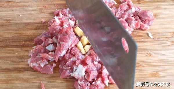2. 将一小块生姜和猪肉一起混合剁碎,装入碗中。