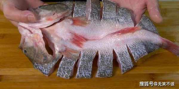 1. 鲈鱼处理好之后,平铺案板上,然后将两边鱼肉切成条。