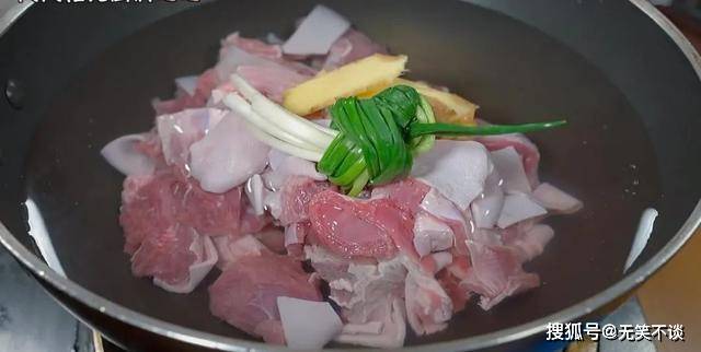 2. 羊肉冷水下锅焯水,加葱结、姜片、料酒去腥,大火煮开后继续煮3分钟,捞出洗净备用。