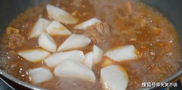 9. 时间到,打开盖子,倒入萝卜块,继续炖15分钟。