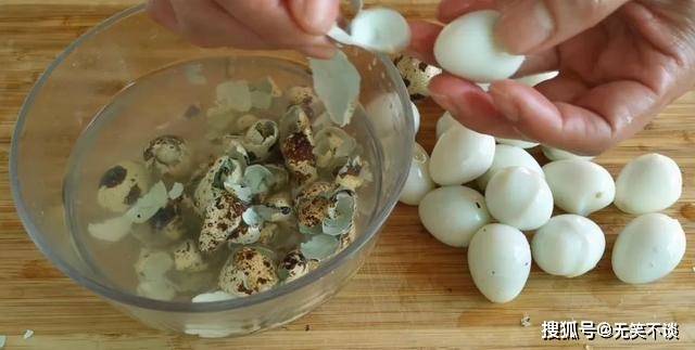 1. 鹌鹑蛋煮熟后剥去外壳备用。
