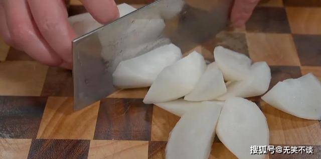 3. 白萝卜先削去外皮,再切滚刀块装盘备用。