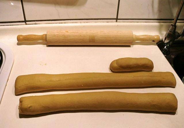 步骤4、从旁边捲起,像捲蛋卷一样成长条形的面团,然后用双手将面团来回滚就会成下图的圆柱状,由于的我的工作台不大,所有我将之切成两段(画面上的一小条食上不规则处用切刀将之切掉的面团揉成一小条);