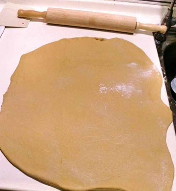 步骤3、用擀面棍帮忙,记住一点要在面团上要撒一些面粉,将面团擀成长方形(不规格处用切刀将之切掉,切下的面团还可以揉成一小条);