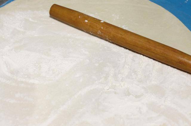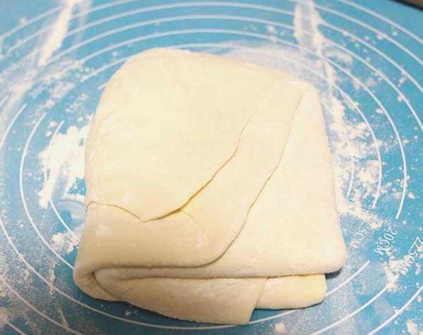 2、弄好了就先让它自己呆在一边去发酵一下,好了以后就将面团弄成大的薄片。然后需要在上面均匀地撒上面粉,进行对折。