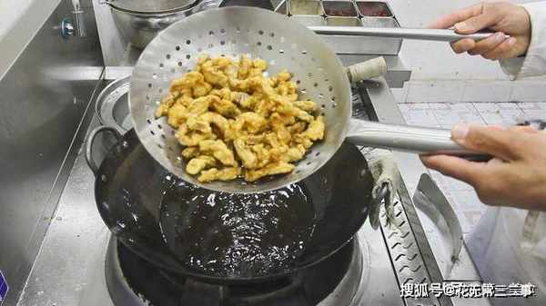 锅里倒油,油烧至5成热时,抓入肉丝,慢慢炸,这个过程保持中火,如果有粘连,就用勺子轻轻打散,把肉丝炸成金黄色,就捞了控油。