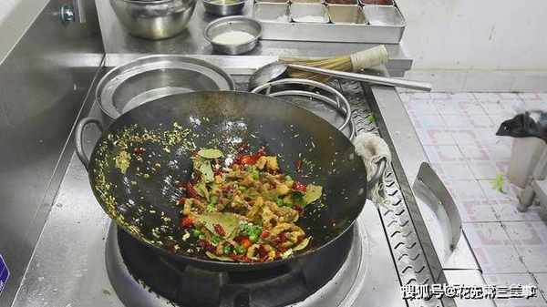 ,佐料,红干椒等,开中火,慢慢煸出佐料的香味,再倒入炸好的肉丝,还有青红线椒,还是保持中火,慢慢炒。