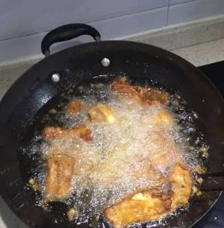 锅中加入食用油,油温烧至6成热,排骨下入之前沾一下红薯淀粉,下入锅中炸透,捞出备用。