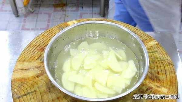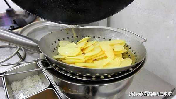 4.食材准备好了,我们把土豆过一下油,锅内烧油,在等待油热的时间,我们把土豆控一下水,油温烧至五成热,放入土豆片,小火炸1分钟左右,炸至金黄色,捞出控油。