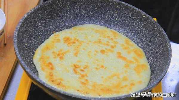 这样面饼不容易粘锅,同时晃动平底锅使面饼均匀受热,沿边再淋入植物油,使饼更酥透,一面煎微黄以后,翻过来煎另一面,另一面也微黄后,再翻一次。
