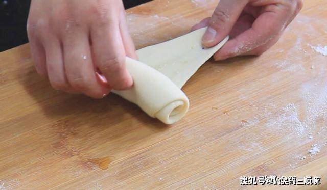 注意别把油酥抹到边,均匀涂抹后,捏住两边拉长面饼,然后从一头沿边缘卷起来。