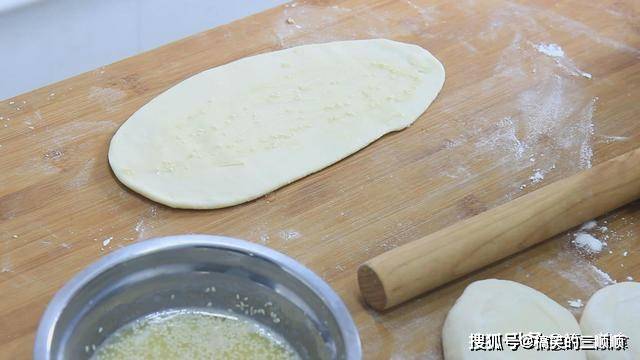把剂子放上然后双手转动剂子揉成团再按压成片,把面团擀成长条形的薄饼,抹上一层油酥。