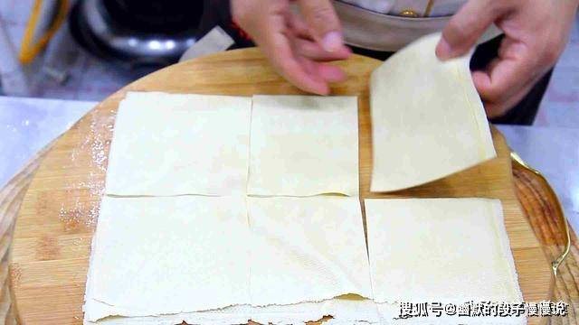3.锅里烧水,水开以后倒入千张,把千张焯水1分钟捞出晾凉以后,切成方形块备用。