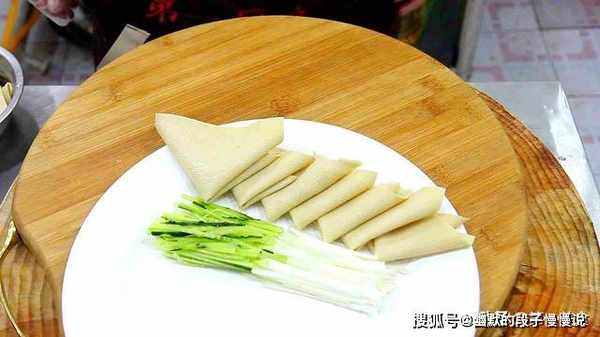 4.黄瓜一小段,切成细丝放在盆中备用,大葱一小段同样切成细丝,把黄瓜丝和大葱丝分别摆在盘中,千张块折叠起来,和黄瓜大葱摆放在一起,大蒜拍扁后,切成碎末,姜同样切成碎末与蒜末放在一起。