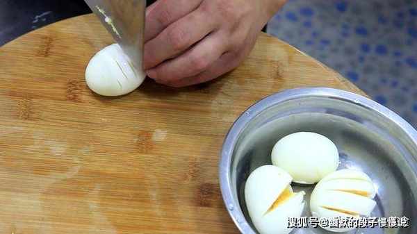 剥去鸡蛋的外壳之后,把每个鸡蛋不同的方向划上几刀,这样便于鸡蛋的后期入味。