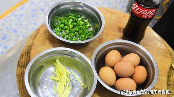 小葱切成葱花;生姜切成姜丝;鸡蛋六个;可乐一瓶。