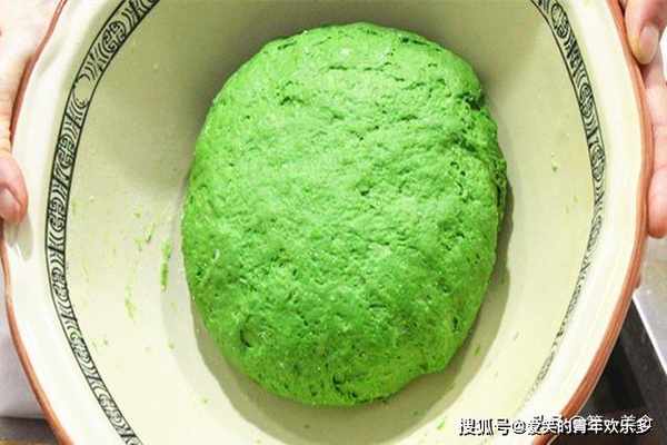 首先,盆中放入适量的面粉,挖出来两勺艾草粉用清水谢开,用艾草水和面,边倒边搅拌,先搅成面絮再揉成团,用盘子盖住发酵至原来的两倍大。