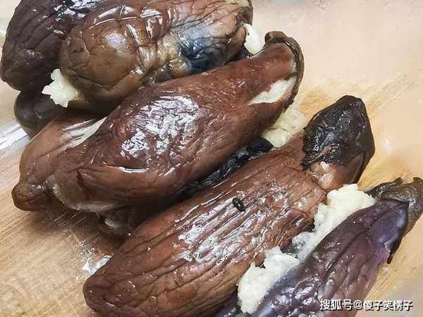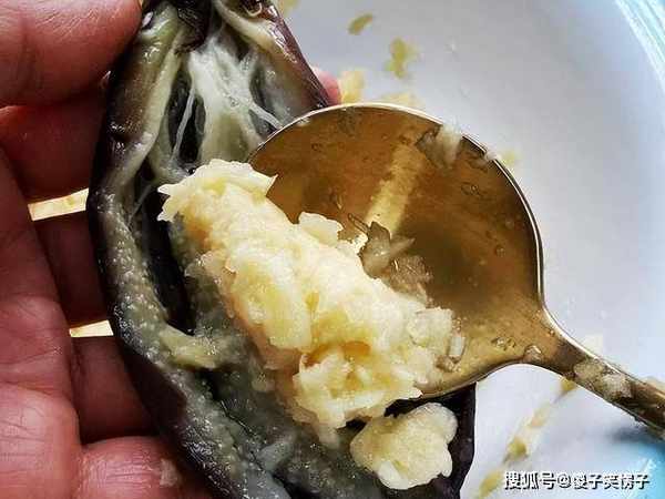 5、此时的茄子,也晾得差不多了,如图所示,将茄子轻轻掰开,小茄子肉很紧实,把大蒜泥釀进去,不多不少铺一层。