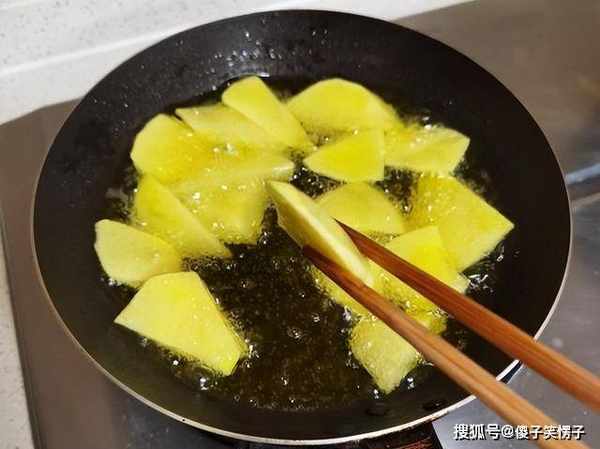 3、起锅烧油,油温6成热的时候,放入土豆块,用中小火慢炸,炸8分钟左右,就差不多了,接着放入青椒,炸20秒钟左右。