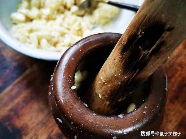 4、晾茄子的时间,可以准备大蒜了,建议用这种蒜臼,它能将大蒜的汁水砸出来,500克茄子、160克蒜泥、30克食盐,按照这个配比,捣碎后再放盐,搅拌均匀。