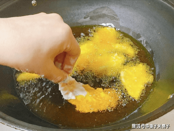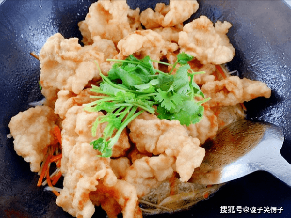 5、复炸好之后,控油捞出,第一次炸至定型变色,第二次高温复炸,可以让肉片表皮更酥脆,里面熟得更均匀,外酥里嫩的技巧,就在这一步,不可忽略。