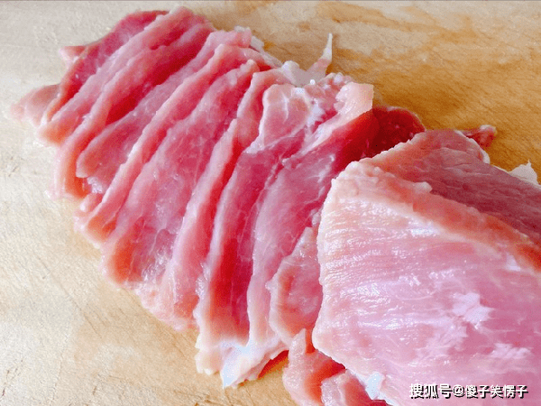 1、准备一块鲜嫩的里脊肉,想要里脊肉好吃,一定要把连在肉上的筋膜去掉,鲜肉最好,改刀切成薄厚均匀的肉片,厚度和一元硬币差不多,大约2毫米的厚度。