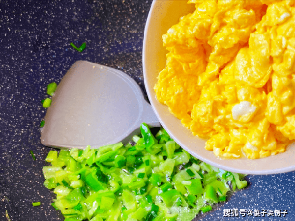 2、重新再放油,倒入葱花爆出香味,接着再倒入炒好的鸡蛋,重新回锅,翻炒均匀。