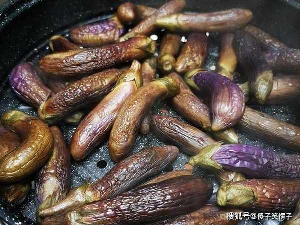 3、这是蒸好的茄子,大约15分钟以后,可以明显看到,茄子都已经蔫巴了,要的就是这种效果,把茄子端出来晾凉。