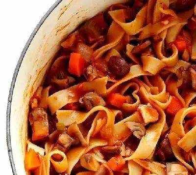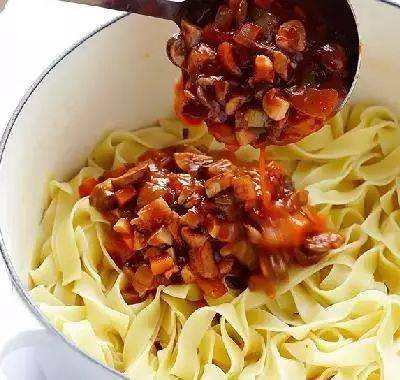 材料:面条、2勺黄油或橄榄油、1个洋葱、1个胡萝卜、芹菜、肉丁、4瓣大蒜、新鲜蘑菇、3杯红葡萄酒、3杯高汤、番茄酱、红辣椒、盐、黑胡椒、干奶酪