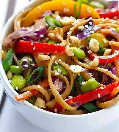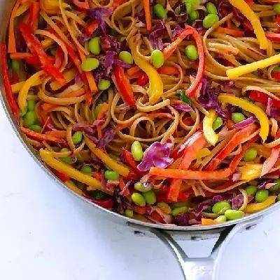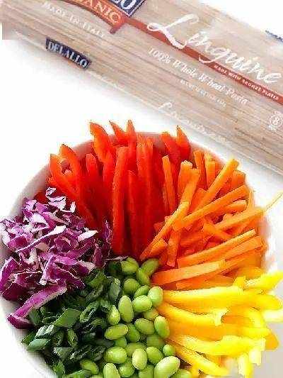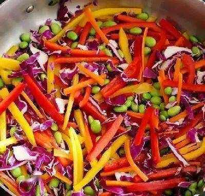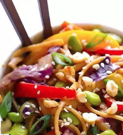 材料:面条、1勺花生油或橄榄油、1个红甜椒、1个黄甜椒、1根胡萝卜、紫甘蓝、毛豆、葱、芝麻、花生碎、50ml花生酱、2勺酱油、2勺食醋、新鲜生姜、大蒜