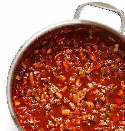 2.热油,加入洋葱,炒至洋葱变软变半透明,加入大蒜炒1分钟,直到香味溢出,加入番茄,番茄酱,盐,黑胡椒和红辣椒片炒匀
