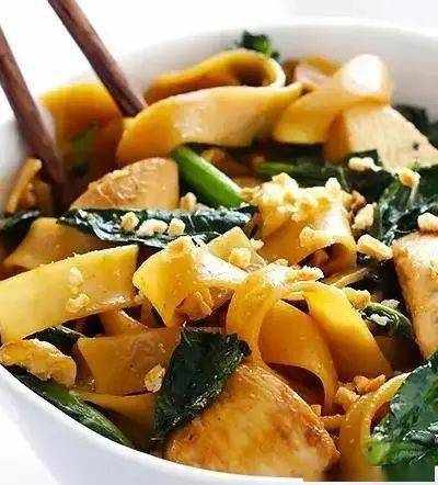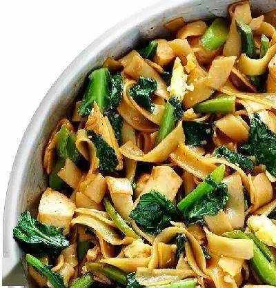 4.热油,爆香蒜粒,将鸡肉、芥蓝一起放进锅里翻炒3分钟后倒入河粉,加入适量酱油、米酒、醋和糖调味,炒匀后即可出锅
