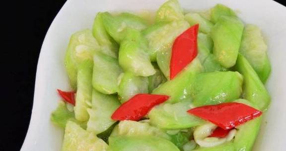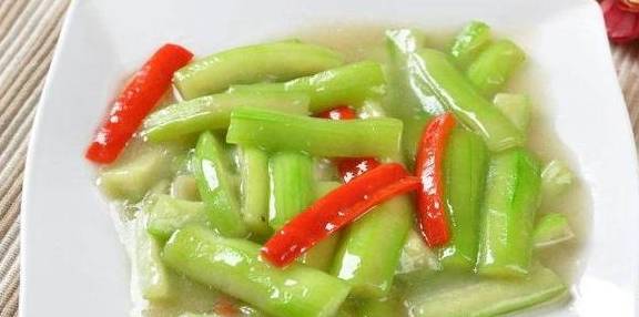 第二步,在锅里烧热油,然后下进蒜蓉炒香,再下入红椒片和丝瓜,翻炒均匀。等到稍微炒出水分的时候,放进150克的清水,煮到软烂,最后在出锅的时候,放进一点盐调味就可以了。