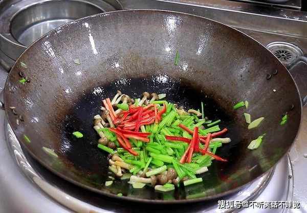 锅内烧油,油温五成热时倒入芹菜段翻炒1分钟左右,芹菜断生、返青以后加入少许食盐,转大火快速翻炒几下倒出来备用。