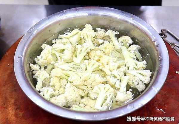 锅中烧水,加入少许食盐入底味,水烧开以后倒入花菜,淋入少许植物油锁住花菜中的营养,大约焯水1分钟,花菜断生以后倒出来控水备用,这一步是为了让花菜生熟一致。