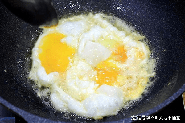 热锅凉油、倒入蛋液,用勺子轻轻地推动、并经常晃动锅让鸡蛋均匀受热,蛋液全部定型以后用勺子打散。