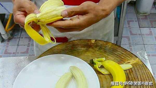 准备四根香蕉,剥掉香蕉皮,切去两头尖的头,再切成四厘米左右的段放在盘中。