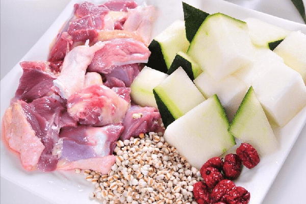 2、鸭子、薏米、姜片,全都倒在砂锅内,加入适量的清水,先煮上1个小时的样子。接着把冬瓜也倒进去,接着炖半个小时这样。最后来一勺盐进行调味,出锅前撒上点葱花或者香菜,开喝。