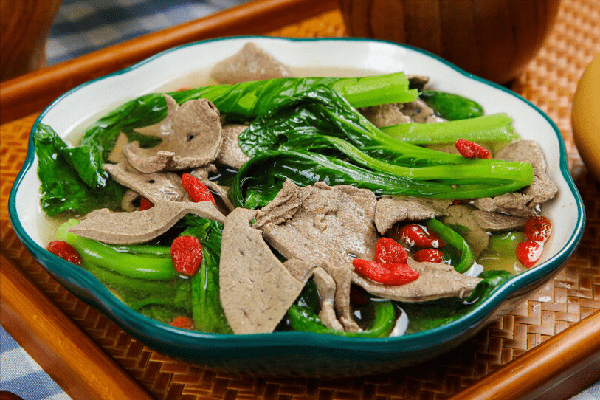 食材:猪肝、枸杞叶、枸杞、盐、鸡精、胡椒粉、料酒、淀粉、生姜