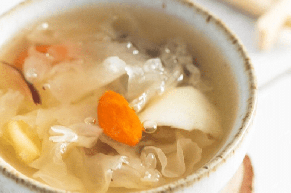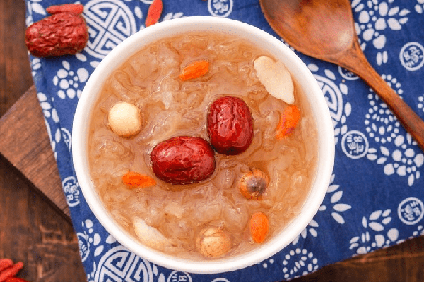 银耳需要提前泡发,百合掰好后,冲洗干净,红枣去核,枸杞洗净。烧一锅水,把洗净的银耳撕成小块,倒在里面,先煮上10几分钟,接着再将百合、红枣、冰糖一起放进去,接着煮20分钟左右,最后加上枸杞,搅拌一下就能喝了。
