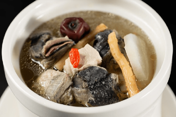 乌鸡处理好,切块洗净,冷水下锅加入姜片和料酒,焯水以后捞出来。党参、当归、红枣、枸杞等,都冲洗干净备用。起锅加水,把乌鸡、党参、当归、红枣、葱姜都放进去,大火煮开后,小火慢炖1个小时,最后放一把枸杞,再来一勺盐,炖5分钟后,关火开喝。