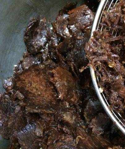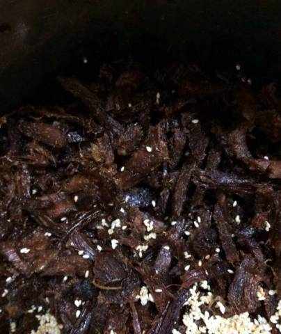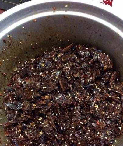 最后就是拌调料,在炸好的牛肉里面加辣椒酱、花椒粉、糖、芝麻